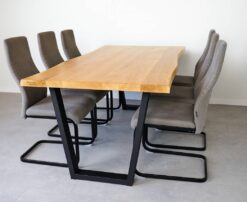 Getragen wird die Platte von einem stabilen, schwarzen Metallgestell in V-Form, das für einen modernen Kontrast sorgt und zugleich optimale Stabilität gewährleistet. Die Kombination aus Holz und Metall verleiht dem Tisch eine industrielle Eleganz und fügt sich harmonisch in unterschiedliche Einrichtungsstile ein.