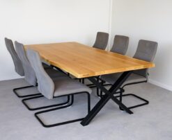 Getragen wird die Platte von einem stabilen, schwarzen Metallgestell in X-Form, das für einen modernen Kontrast sorgt und zugleich optimale Stabilität gewährleistet. Die Kombination aus Holz und Metall verleiht dem Tisch eine industrielle Eleganz und fügt sich harmonisch in unterschiedliche Einrichtungsstile ein.